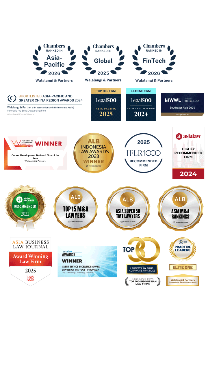 Walalangi & Partners (W&P) is a corporate law firm and is highly praised by its clients for its swift responsiveness, thorough analysis, as well as comprehensive and out-of-the-box legal and practical solutions and advice.With its vast experience and well-maintained relationship with various governmental authorities and relevant stakeholders, the team is able to facilitate smooth and less-barrier communication between clients and the relevant governmental authorities and stakeholders, and therefore provide tailor-made practical solutions, in aligning clients’ commercial intentions with the applicable regulatory requirements, and ultimately support and help clients’ business decision-making processes to minimize any potential corresponding risks.